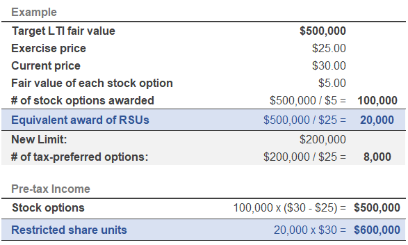 For illustrative purposes, here is an example where the new taxation rules could negatively impact the after-tax payout from your LTI plan. In this scenario, we will assume that the target dollar amount of your long-term incentives is $500,000, and compare the difference between the after-tax income from an option award and from an equivalent award of restricted share units (RSUs), which are simply taxed as ordinary income upon vesting: